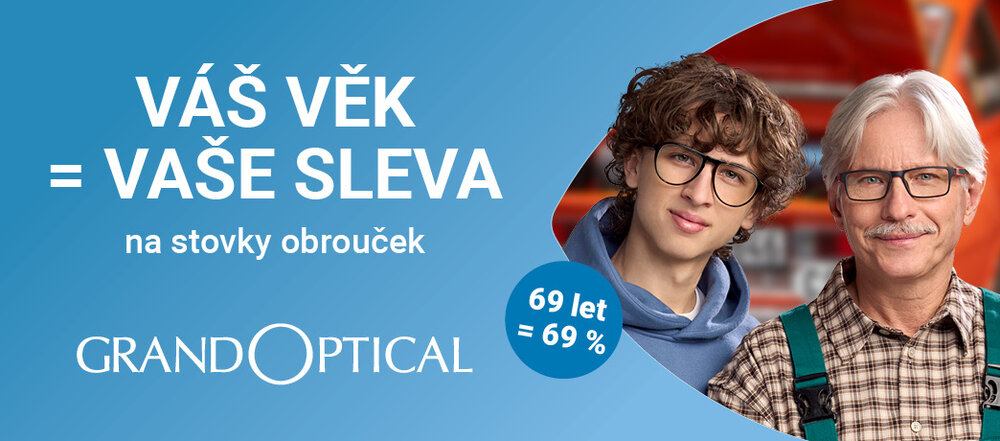 Sleva podle věku se vrací! Stavte se pro nové brýle a ušetřete na stylových obroučkách přesně tolik procent, kolik je Vám let. Sleva se vztahuje na vybrané obruby a platí při nákupu kompletních dioptrických brýlí (obruba + brýlové čočky). Více informací v prodejně GrandOptical nebo ZDE
